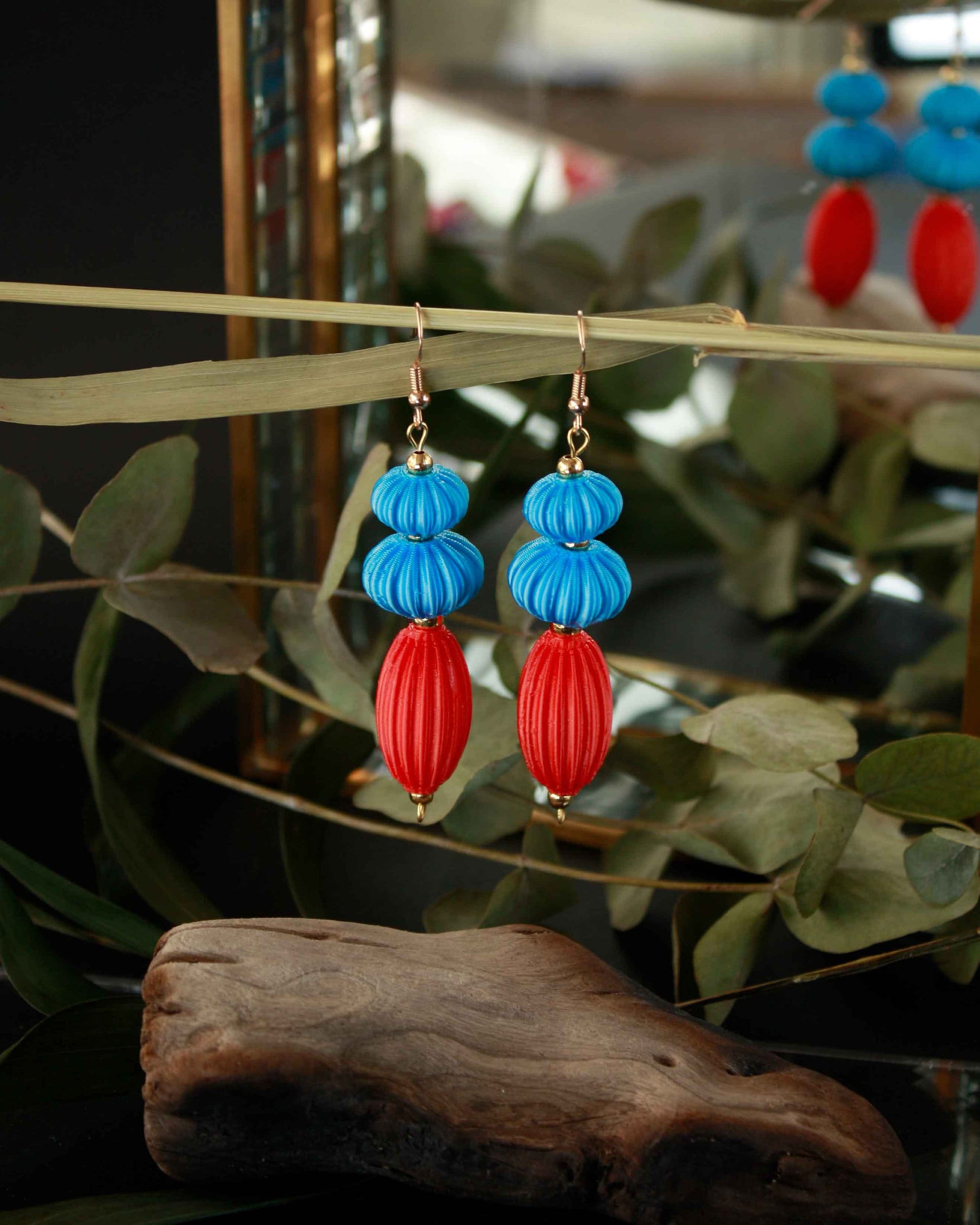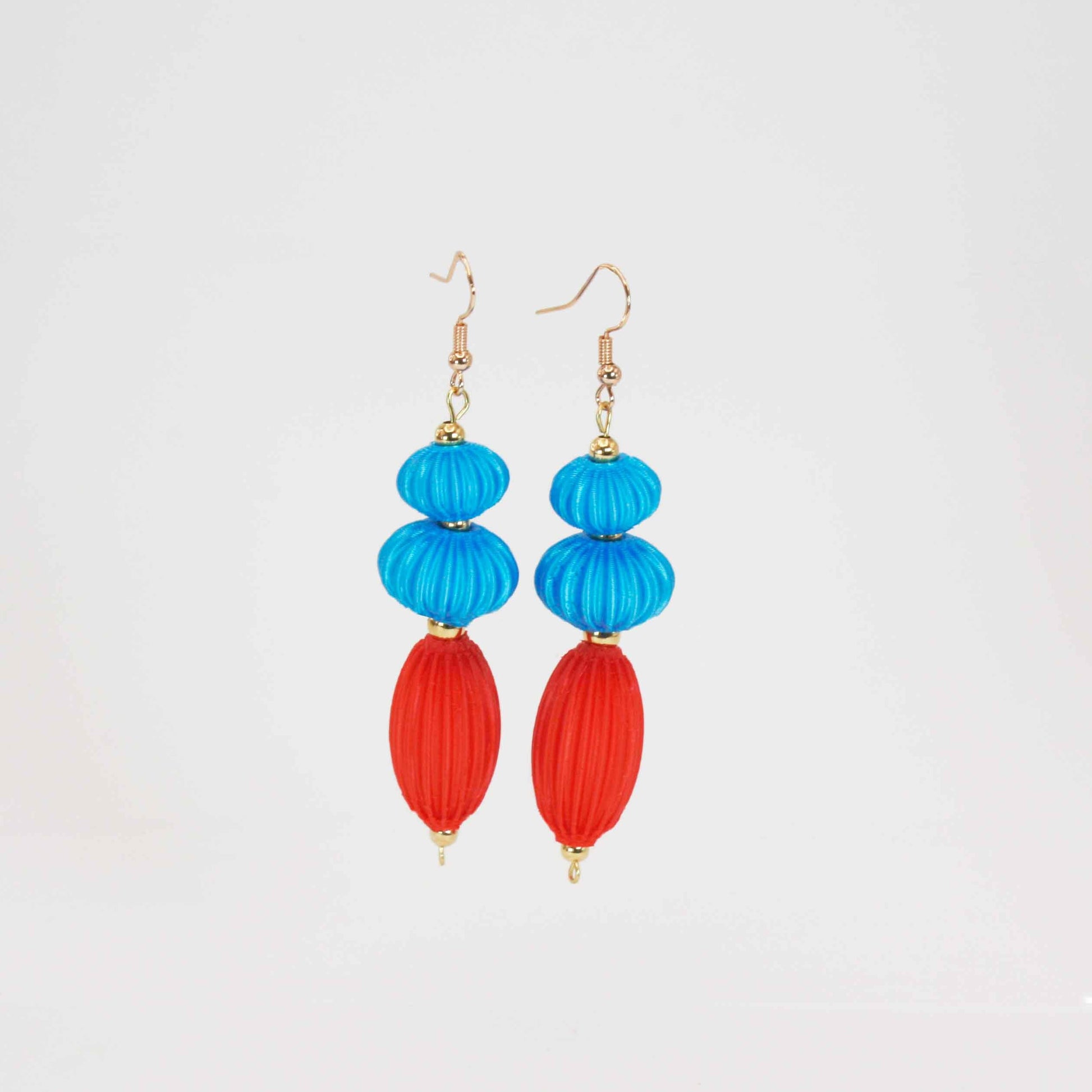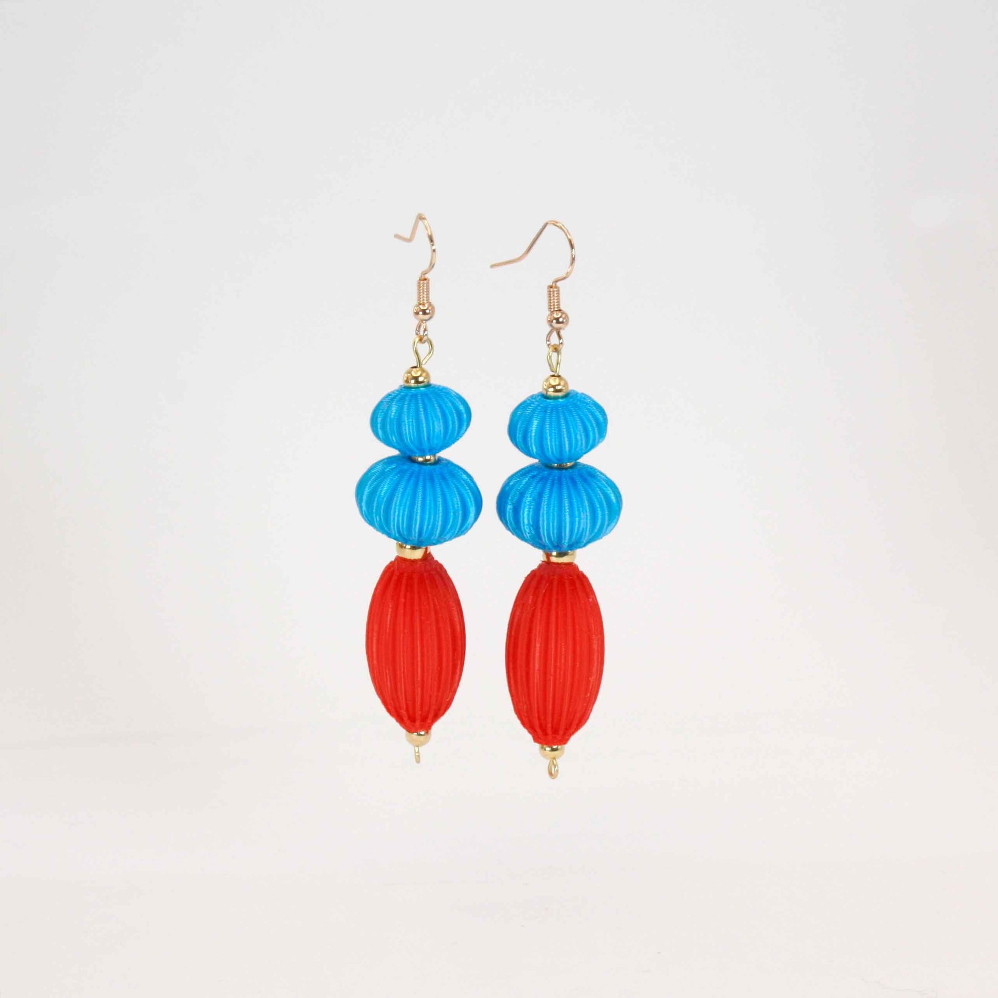 Anemone earrings from the Lukt collection, in Cyan and Coral, 3D printed, very light and sophisticated.