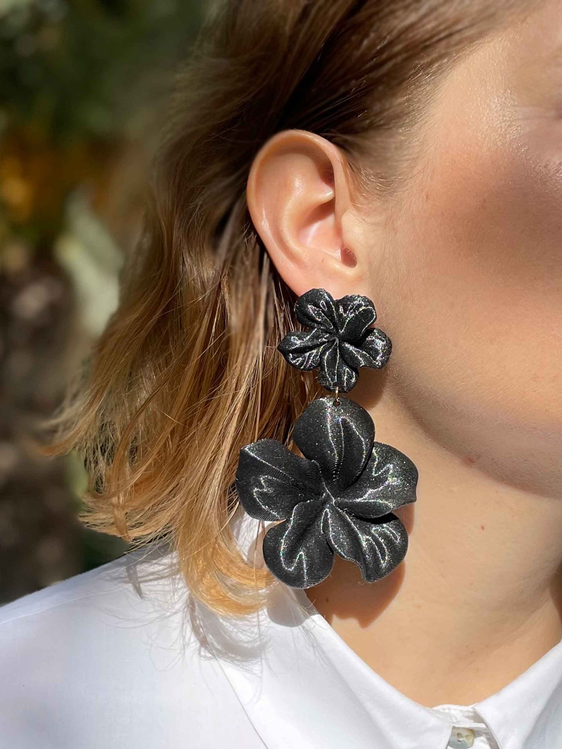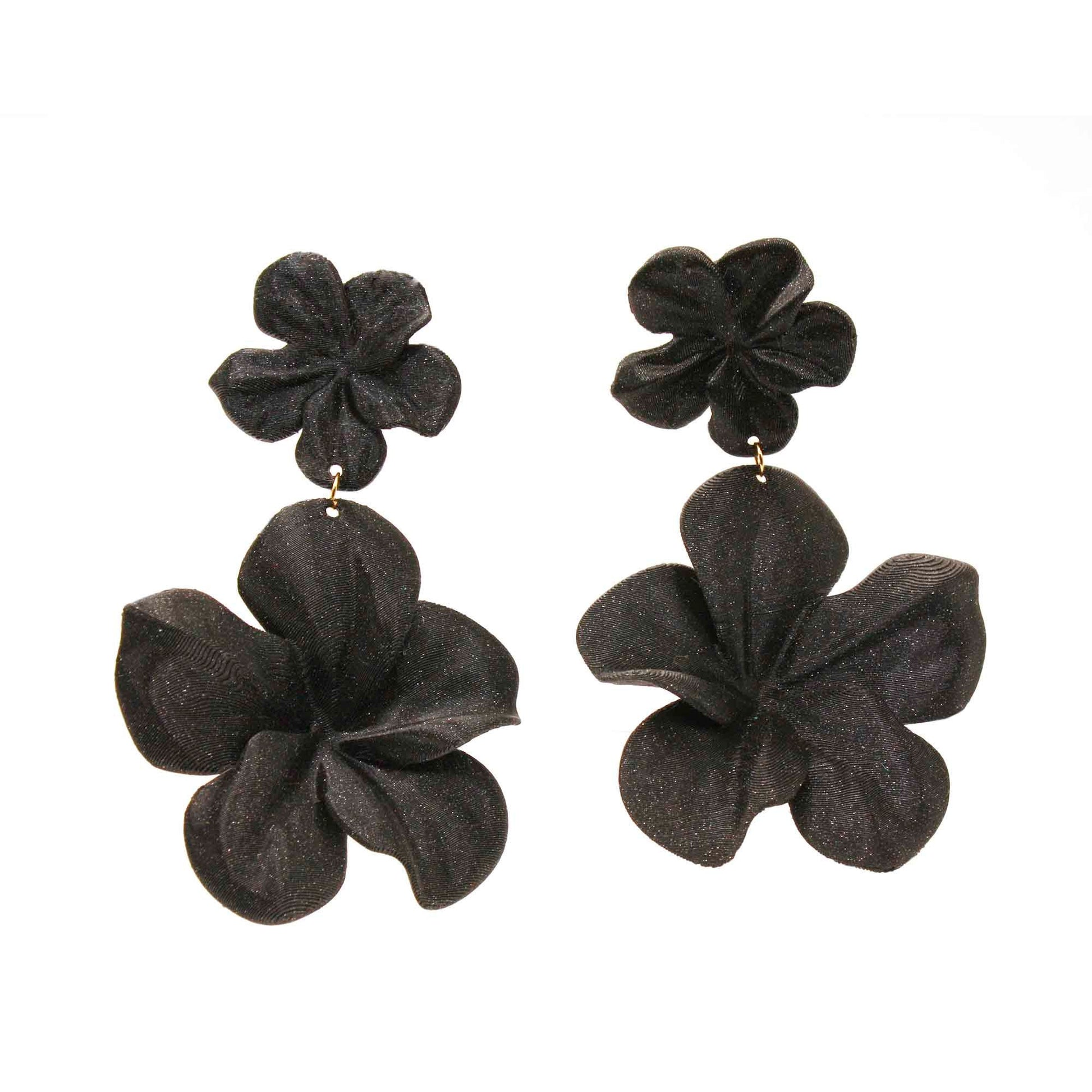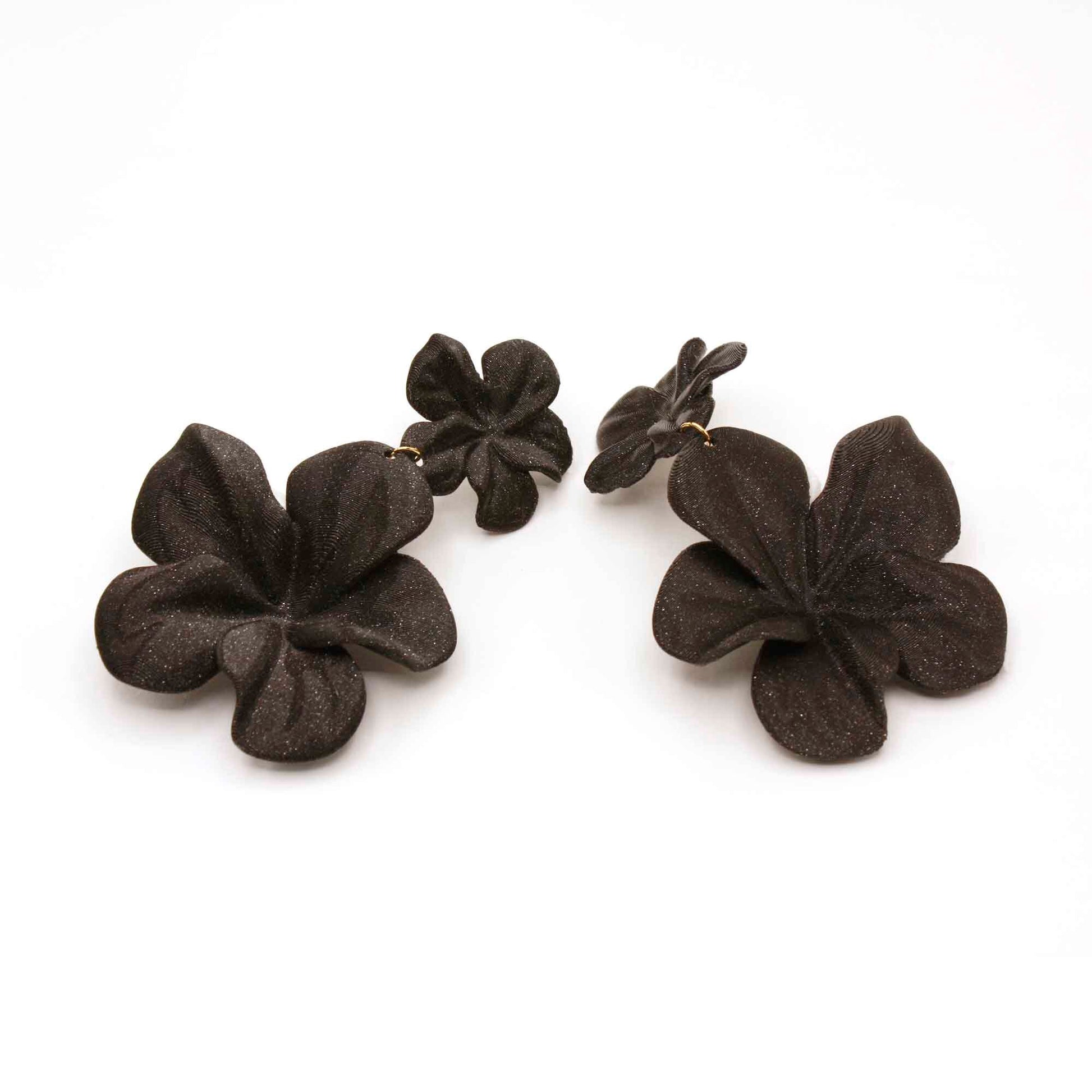 Large black hibiscus earrings. 3D printed in black with metallic details, shaped like a feather-light flower.