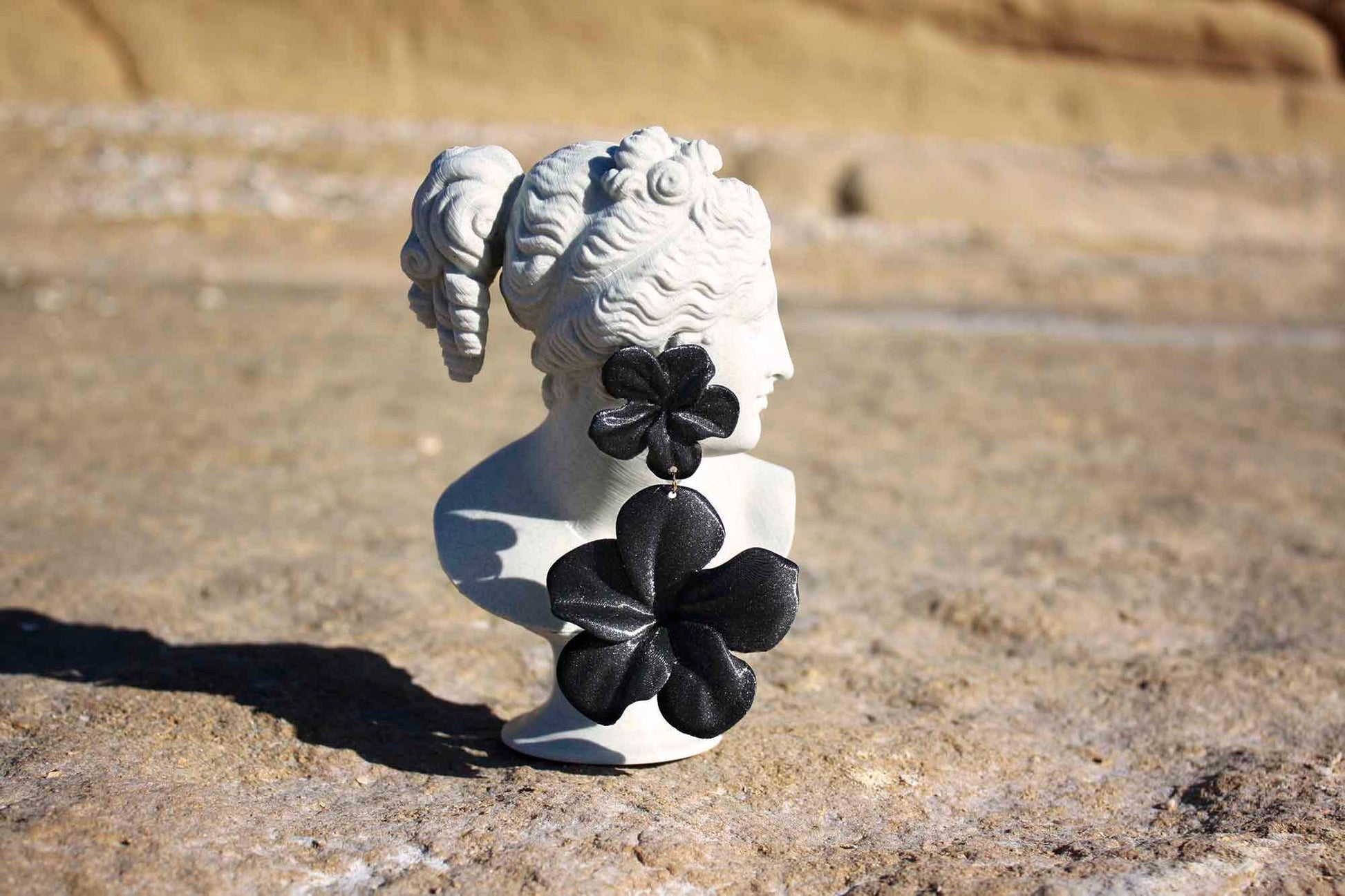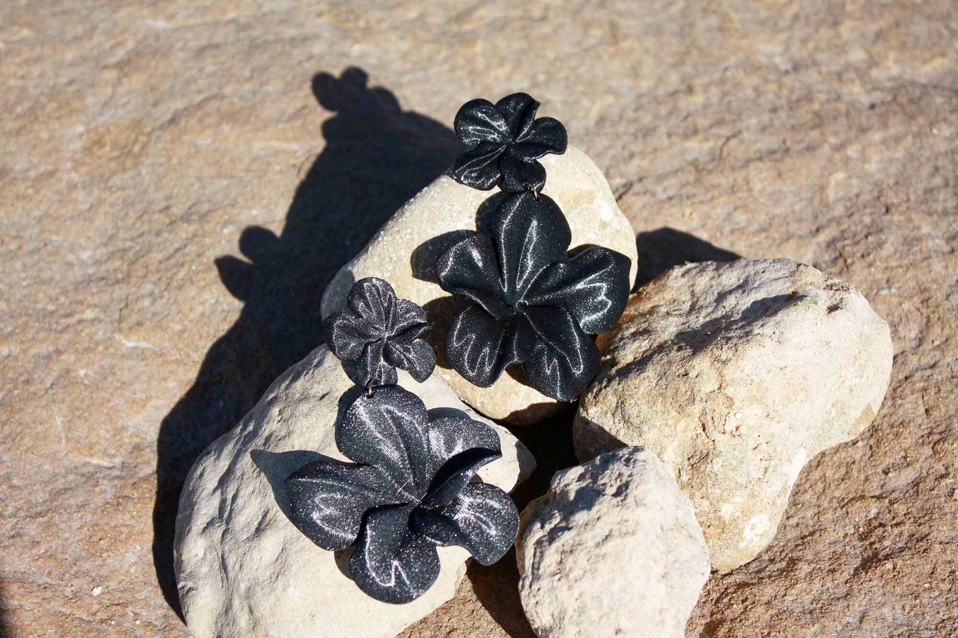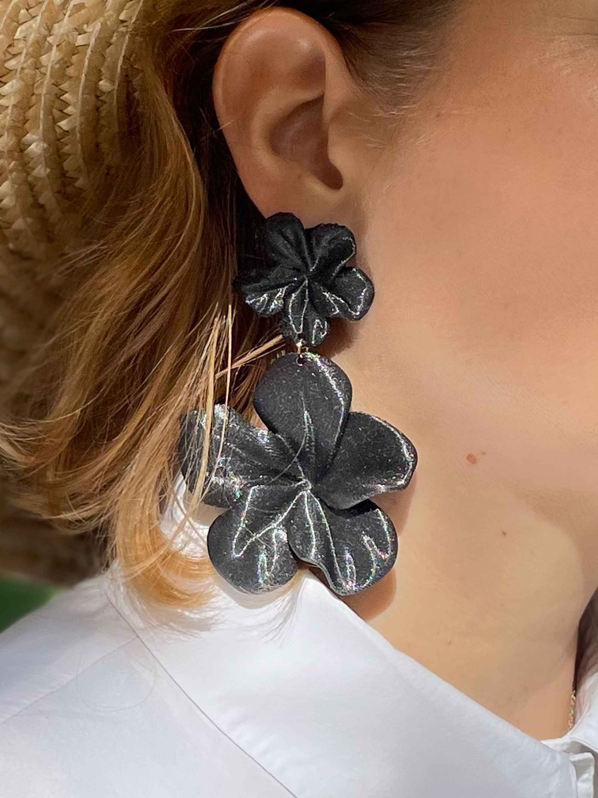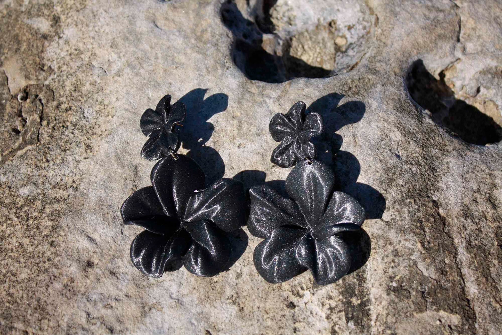 Large black hibiscus earrings. 3D printed in black with metallic details, shaped like a feather-light flower.