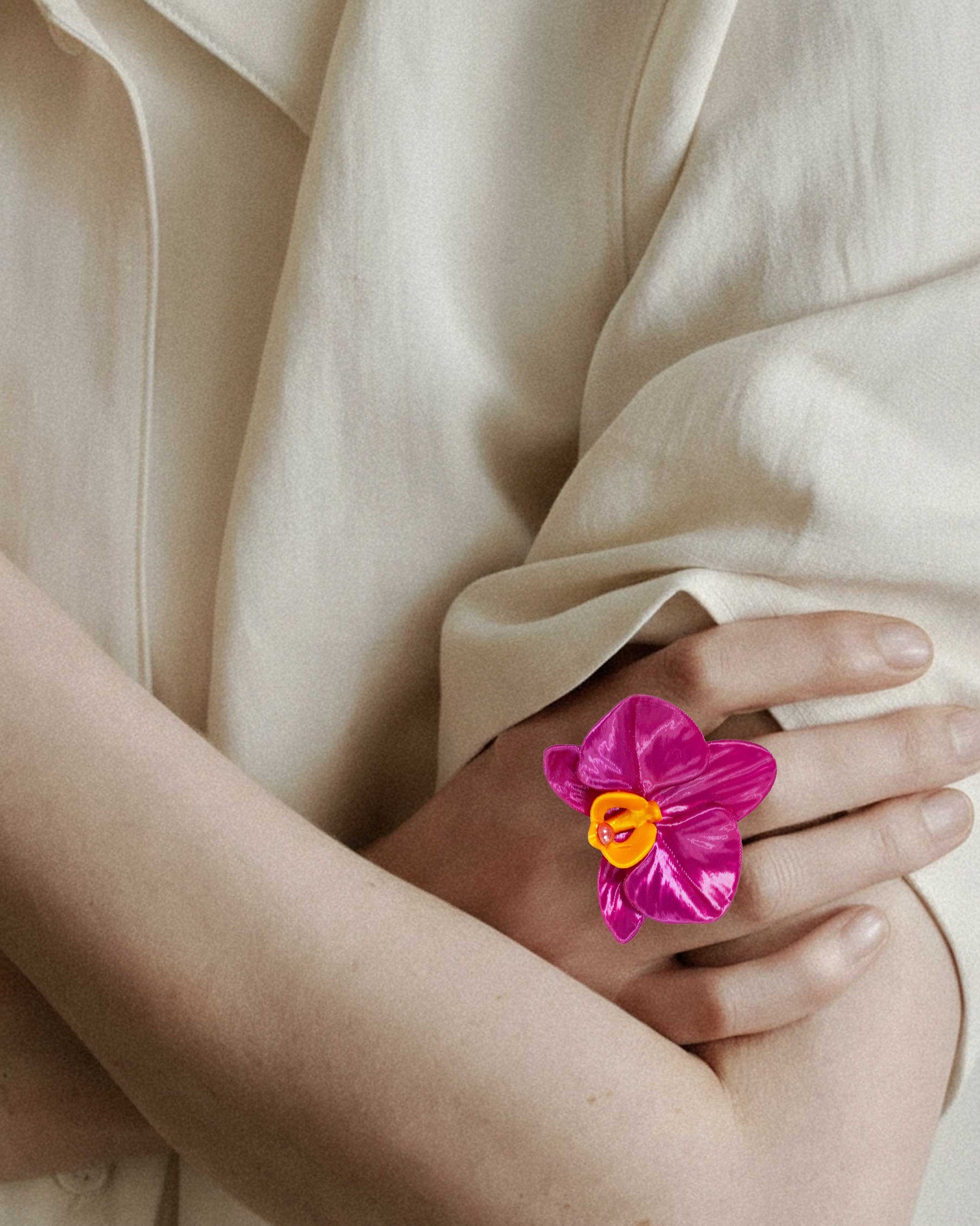 Llévalo solo o combinado con los pendientes y collares de la colección Orquídeas para crear tu propio jardín contemporáneo.