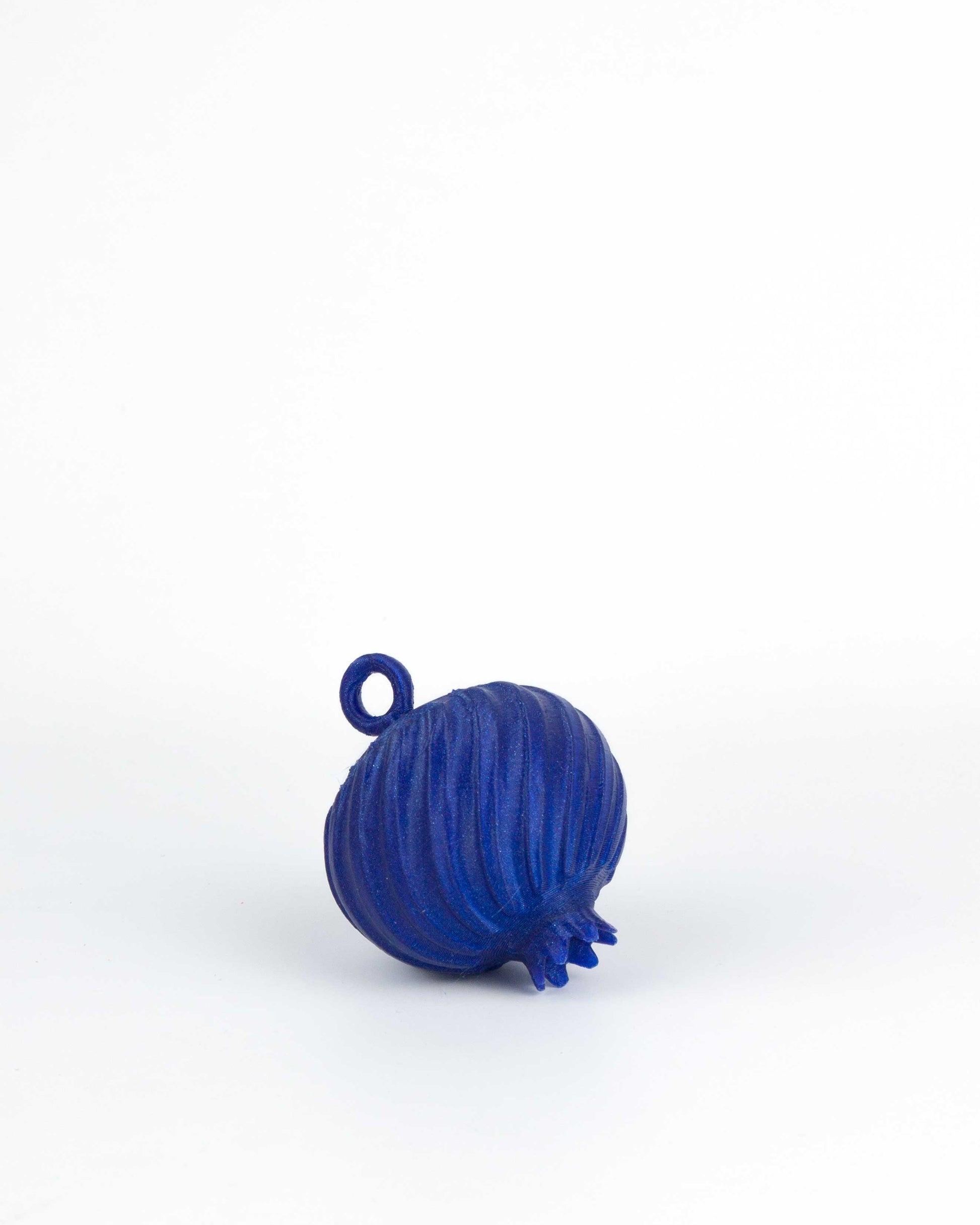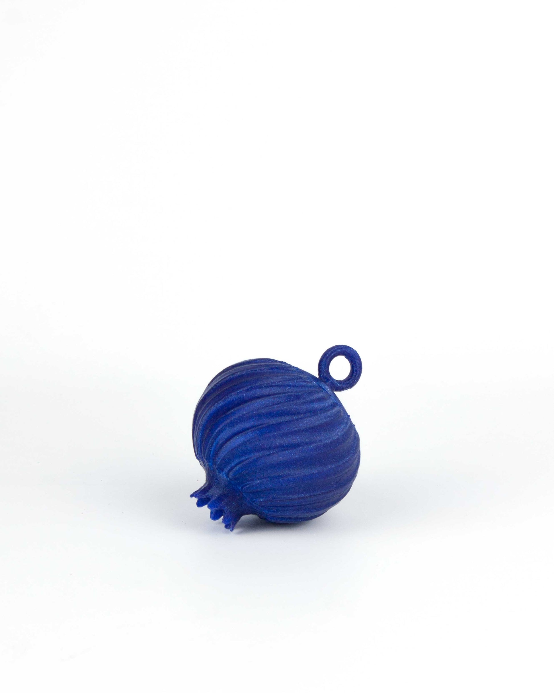 Tres adornos navideños con forma de granada en un vibrante azul zafiro que desafían la convención. Inspirados en la icónica fruta de Elche, estos adornos fusionan lo artesanal con la tecnología de impresión 3D, creando piezas que rompen con lo ordinario. Cuelga del árbol un toque audaz y sostenible que celebra la tradición con una actitud moderna y sin disculpas. Para quienes se atreven a decorar diferente.