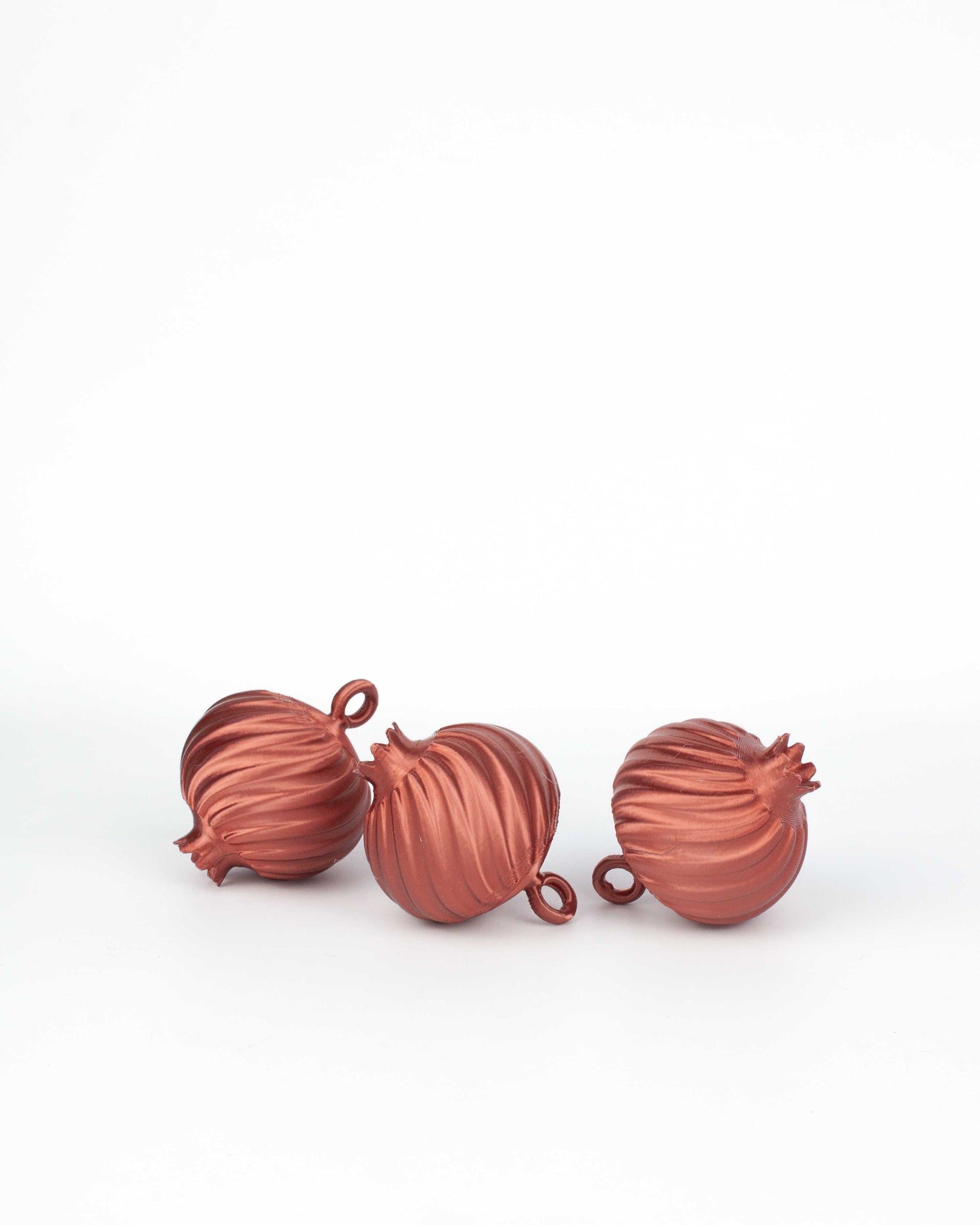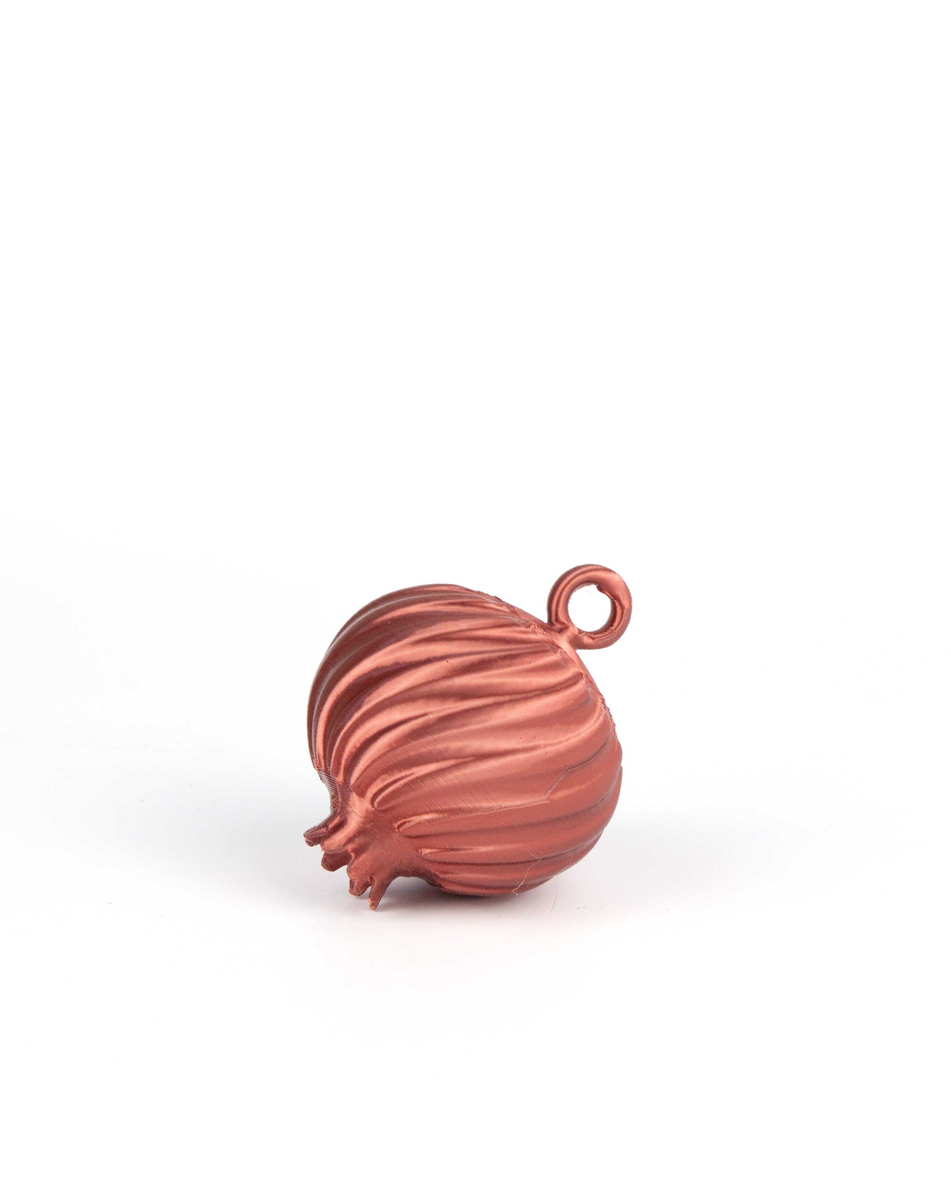 Esta bola con forma de granada, impresa en 3D con biomaterial sostenible, ilumina el árbol con su brillo cobre rojizo, que parece cobrar vida con la luz.