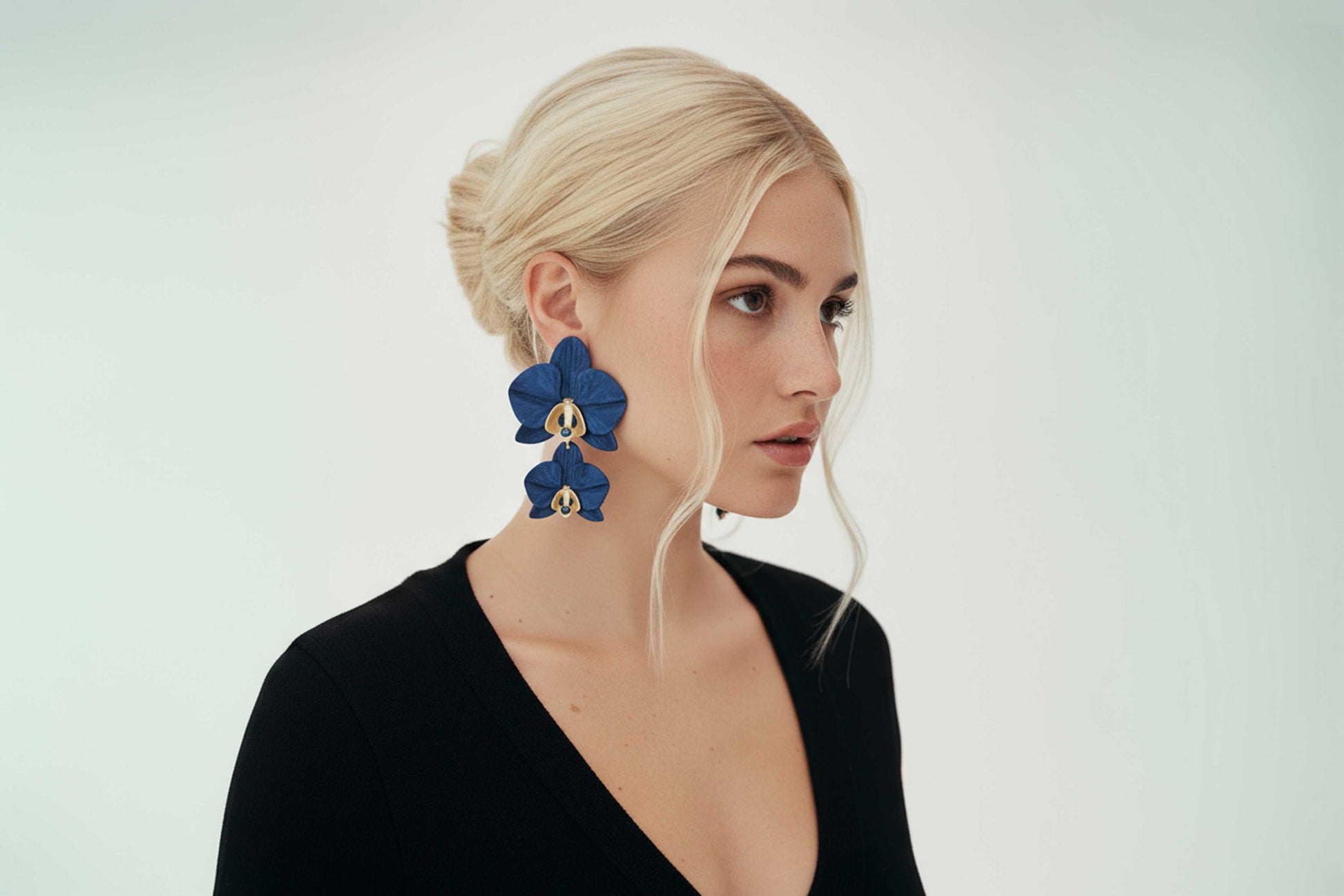 Los pendientes Phalaenopsis Gemina celebran la unión de dos flores que parecen reflejarse.