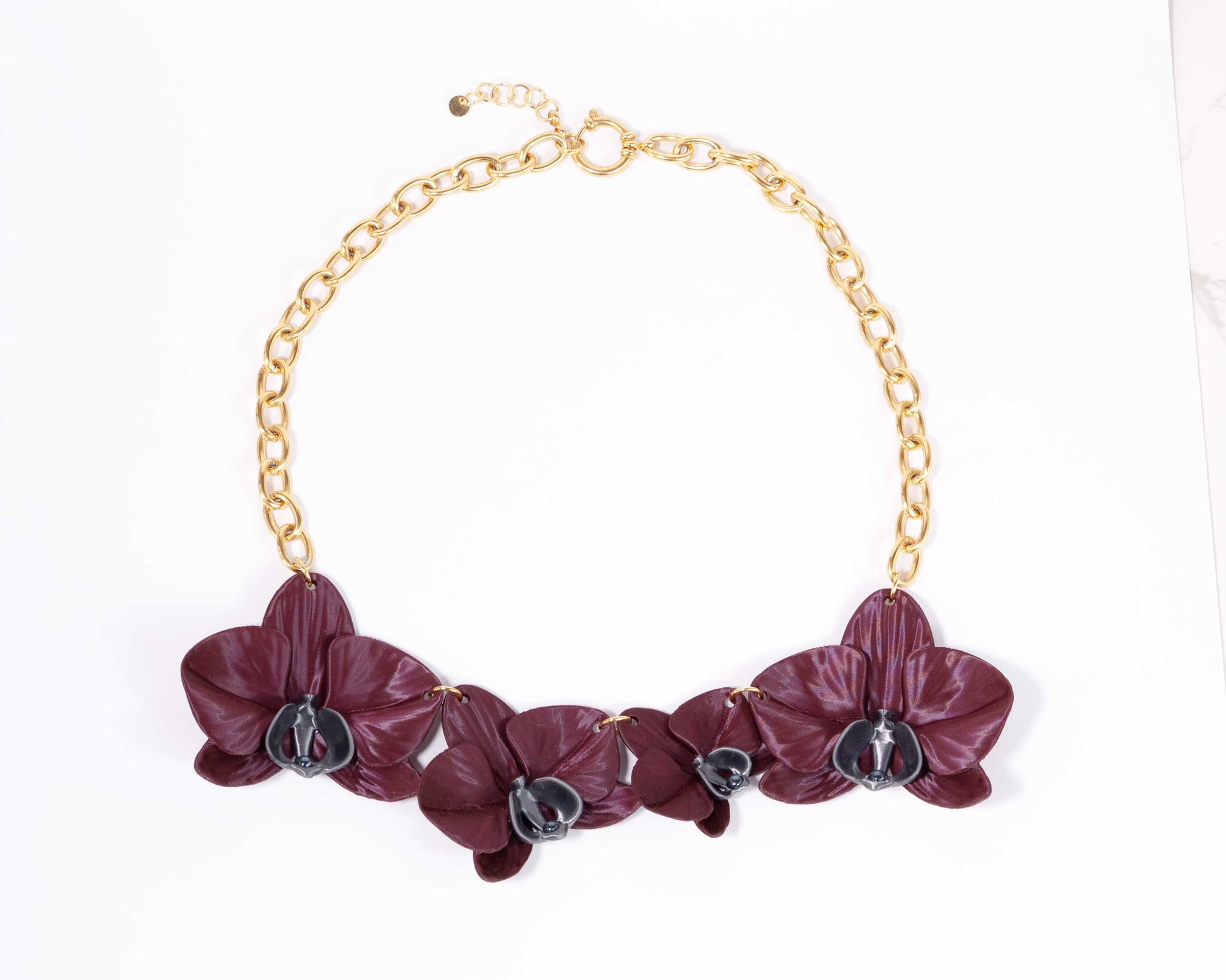 Sus seis flores, modeladas en biomaterial sostenible, descansan sobre una cadena dorada artesanal que envuelve el cuello con presencia y equilibrio.